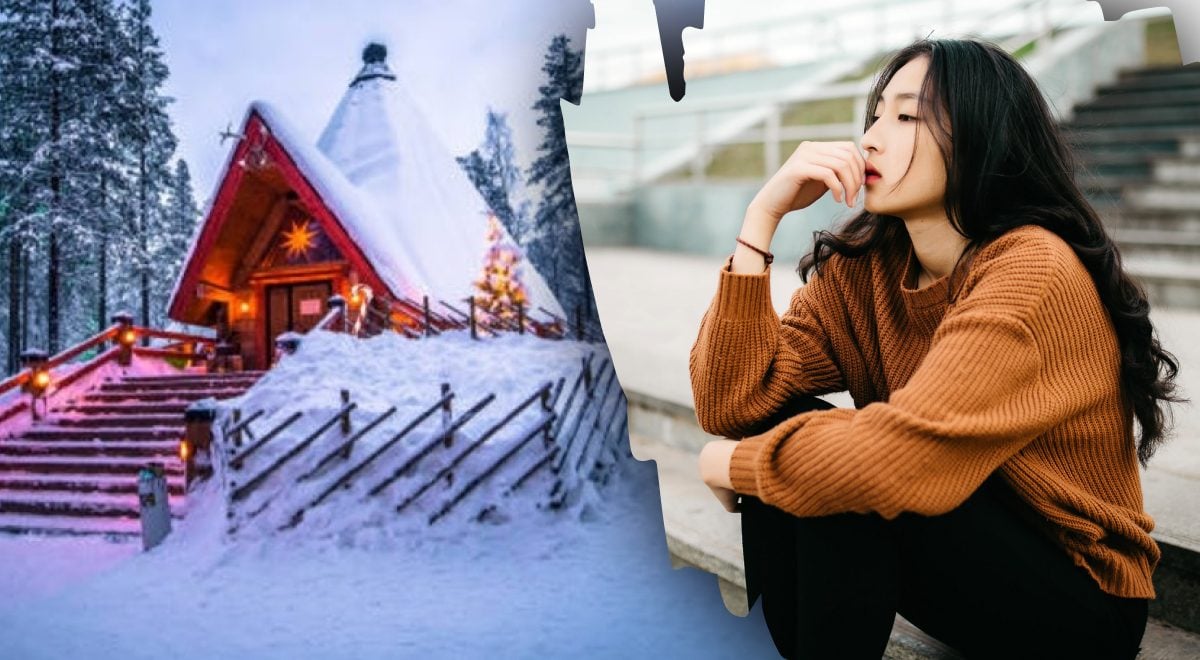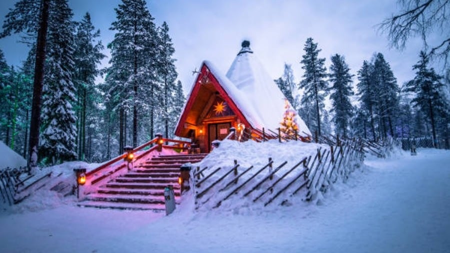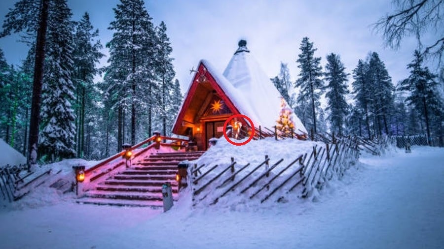 Imaginea prezintă o casă, la care trebuie să urci pe o scară mare. În jurul locuinței este o pădure de conifere, crengile copacilor sunt arcuite de cantitatea mare de zăpadă. Luminile strălucesc în afara casei, iar întreaga curte este acoperită cu un strat gros de zăpadă, care acoperă aproape complet gardul.