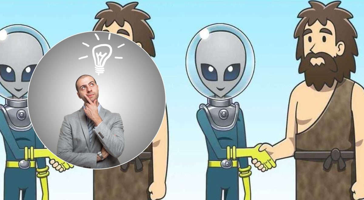 În imaginea prezentată, puteți observa doi extratereștri identici și doi oameni ai cavernelor.