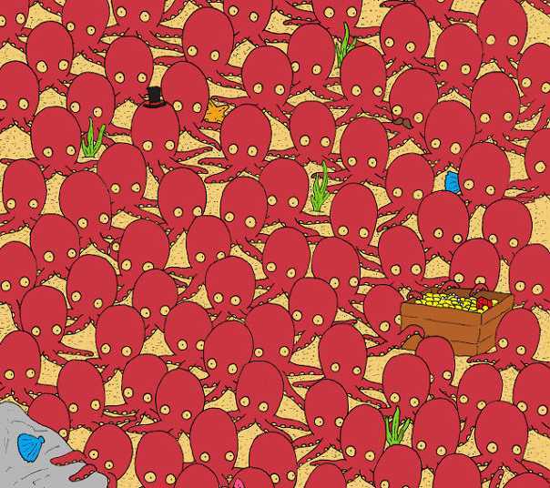 Imaginea arată o mulțime de caracatițe, care par să fi găsit un cufăr cu aur. Sarcina noastră este să găsim peștele aici.