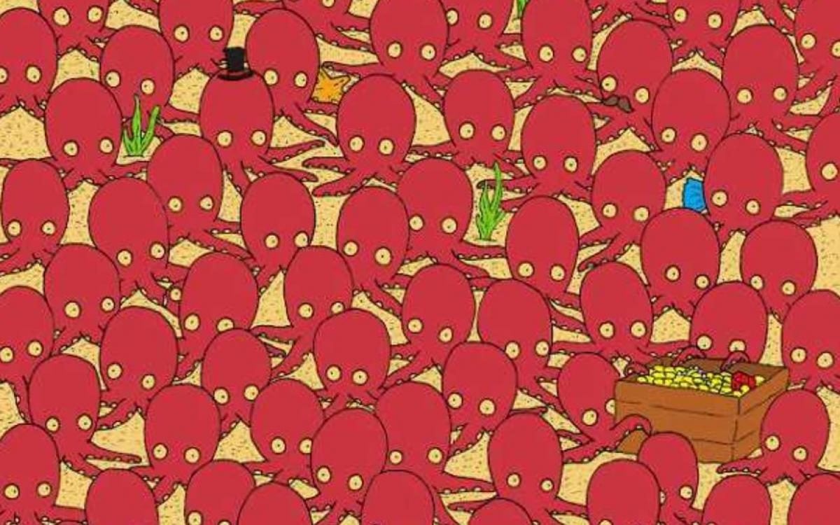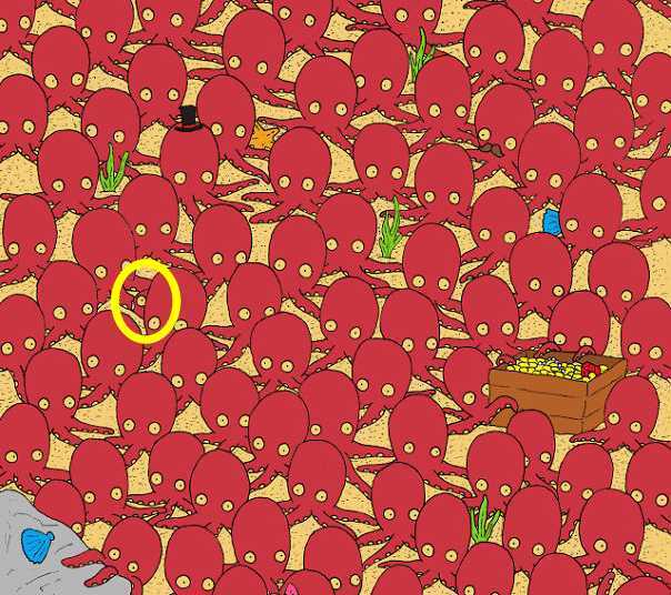 Nu ați putut găsi caracatița? Iată un indiciu: uită-te în centrul imaginii și apoi puțin la stânga. Acolo se ascunde peștele. Răspunsul corect este încercuit în galben.