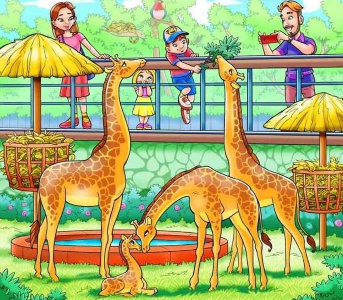 Imaginea este a unei familii la grădina zoologică. Bărbatul filmează girafele cu telefonul, iar copiii și soția lui se uită la animale. Undeva este ascunsă o maimuță, pe care trebuie să o găsiți.