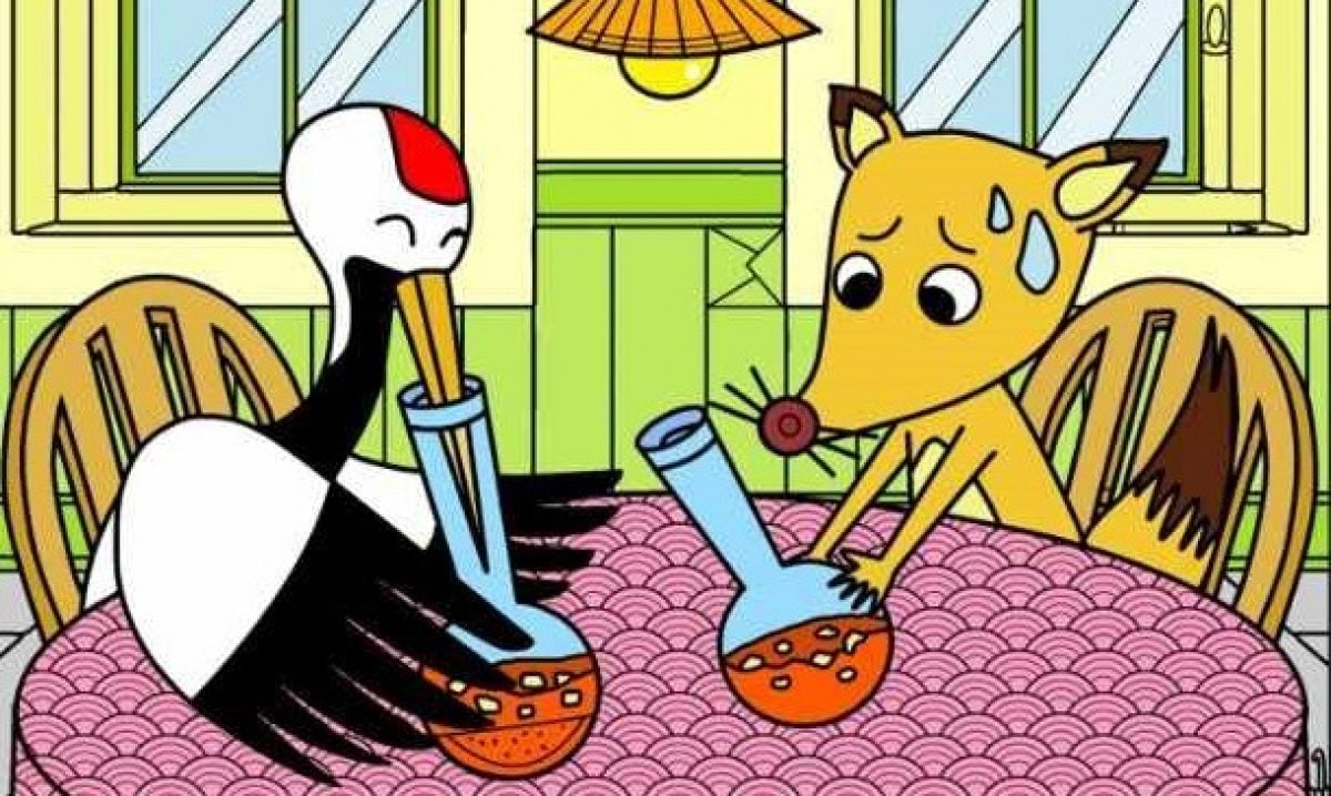 În imagine vedem o scenă din celebra poveste a vulpii și cocorului. În timp ce cocorul consumă cu plăcere hrana dintr-un flacon îngust, vulpea doar privește cu invidie recipientul din care nu poate obține mâncarea gustoasă.